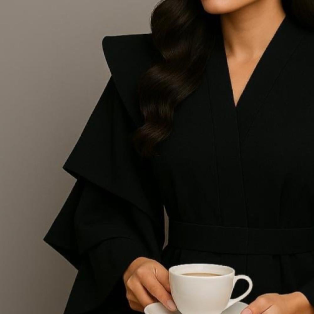 عباية بيان عبايه اكمام شفافه بخامة كريب أنيق بتصميم أكتاف حادة تعكس الهيبة، وأكمام بطبقتين تنتهي بتول منقط شفاف يوازن بين الجرأة والأنوثة. مثالية للمناسبات الرسمية والإطلالات الفخمة.