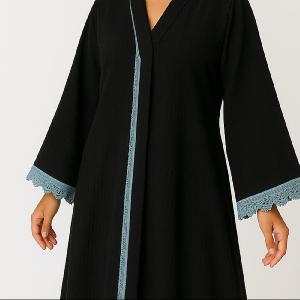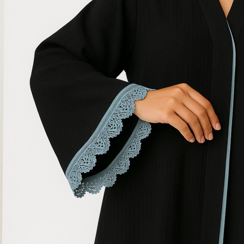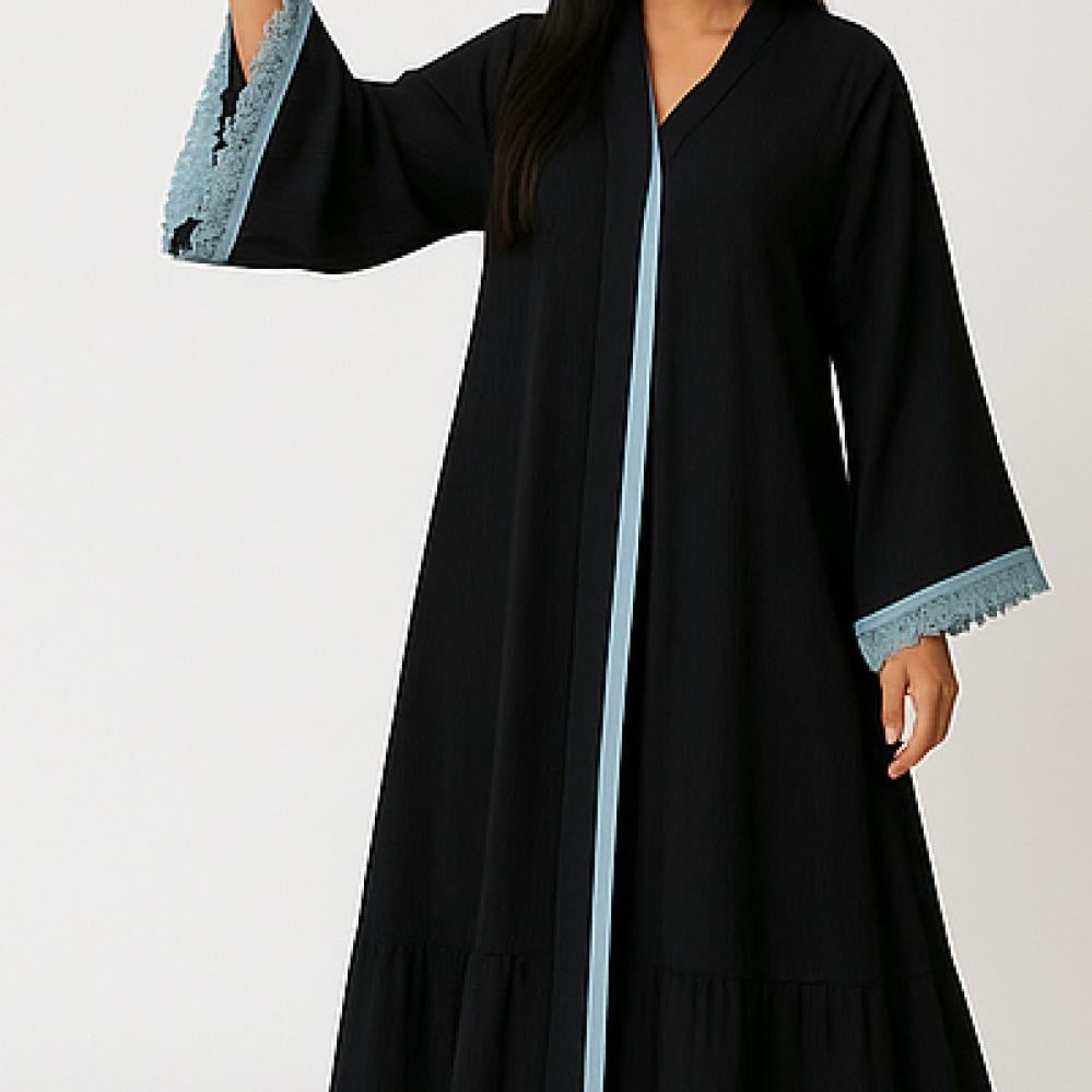 جربي عباية كريب ناعم (فجر ) بتفاصيل دانتيل سماوي على الأكمام والحاشية بتصميم انسيابي وأنيق يبرز أنوثتك بكل بساطة و مثالية للمشاوير اليومية والطلعات العملية سوف تمنحك الثقة بأدق التفاصيل.