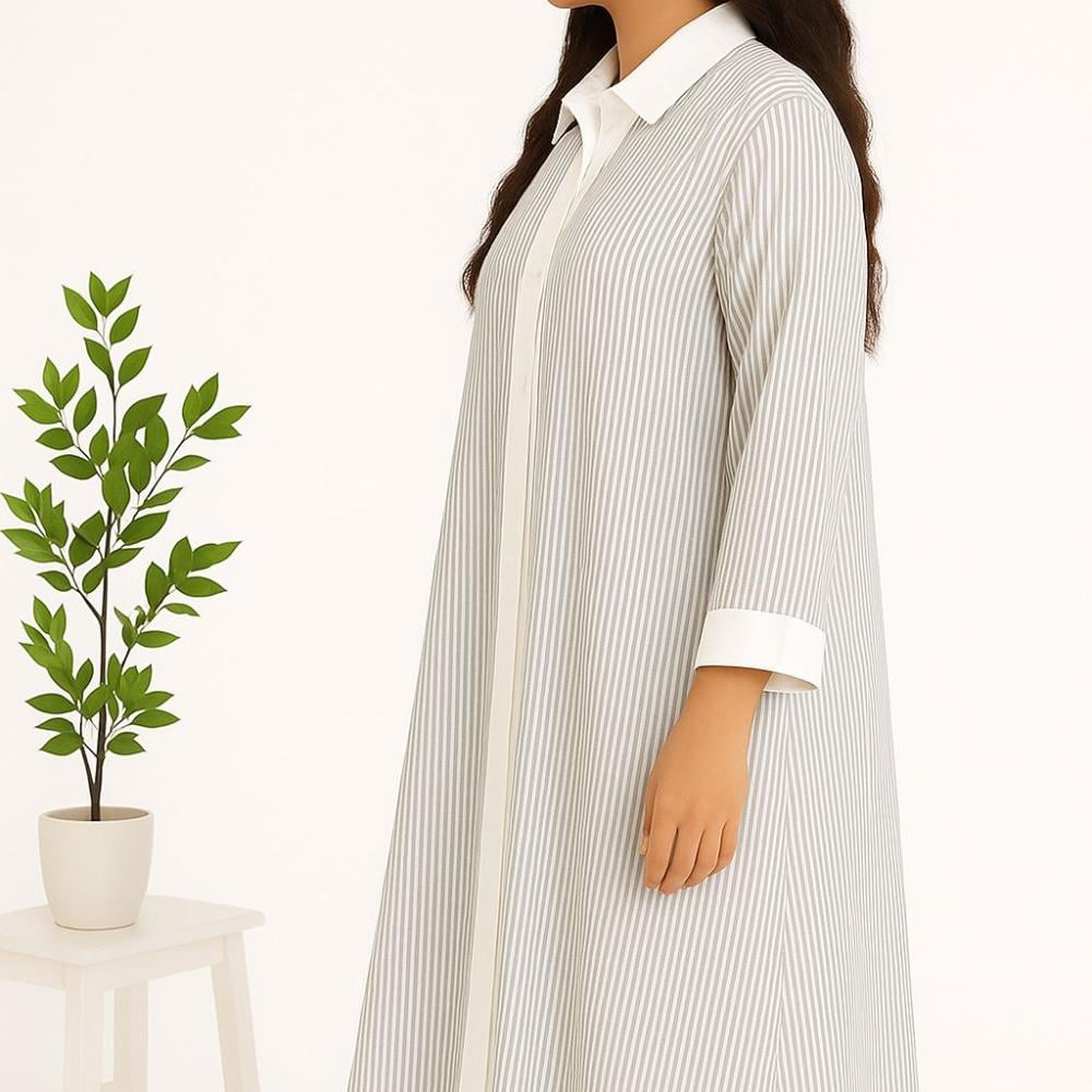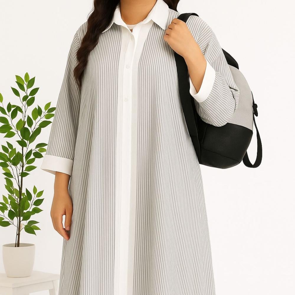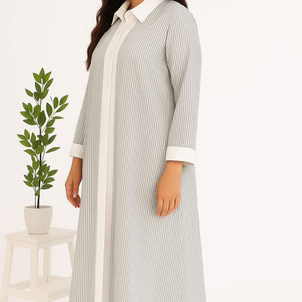 عباية “نسيم” بتصميم عصري بسيط يجمع بين الراحة والأناقة. مصنوعة من قماش مخطط ناعم بخطوط طولية تعطي إيحاء بالنحافة والطول، مع ياقة وقبّة وأطراف أكمام بلون أبيض لإضفاء لمسة كلاسيكية راقية. مناسبة للإطلالات اليومية أو الرسمية، وتمنحك حضورًا هادئًا وأنيقًا في كل وقت.
